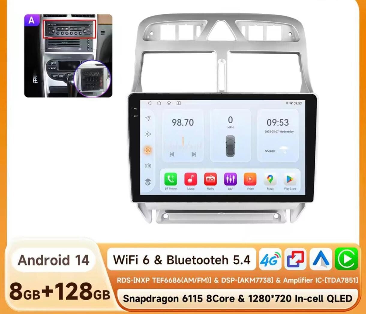Peugeot 307 - carplay radio scherm - 9 Inch - 2002 t/m 2013