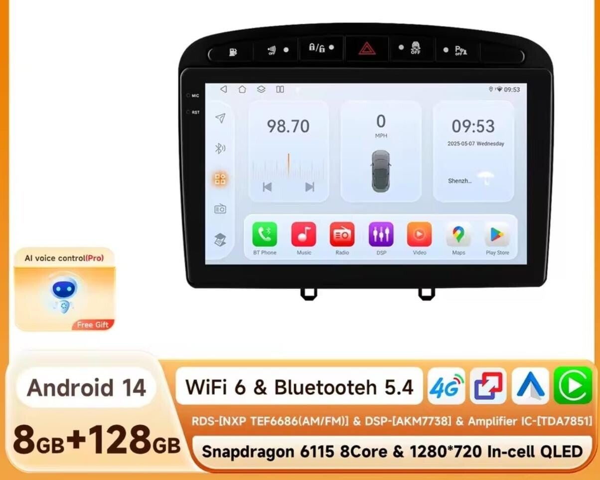 Peugeot 308 - carplay radio scherm - 9 Inch - 2012 t/m 2020