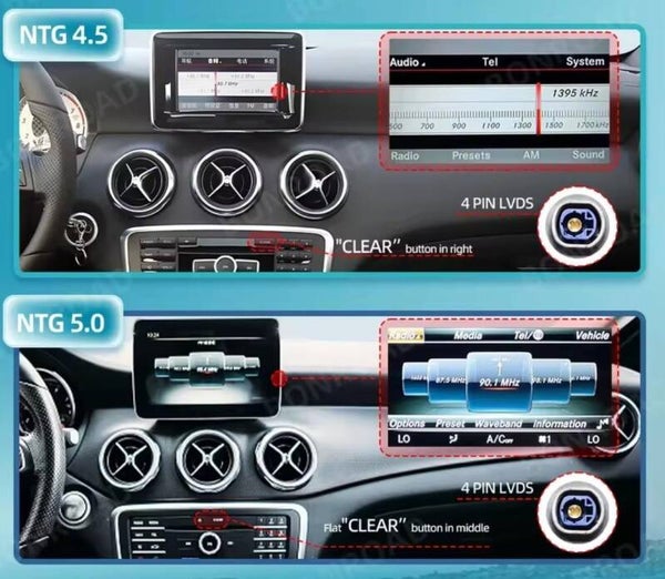 - Er zijn 2 verschillende type aansluitingen. NTG 4.5 en NTG 5.0. Bekijk de foto's zorgvuldig om het juiste model te selecteren voor uw auto voor aankoop.